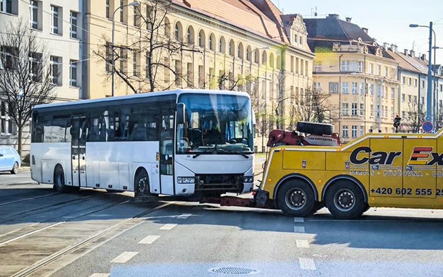 Řidič pak mohl s porouchaným autobusem vyčkat na příjezd odtahového vozu tak, aby neblokoval křižovatku a zhruba o dvě hodiny později se už autobus spokojeně vezl za tahačem odtahové služby.